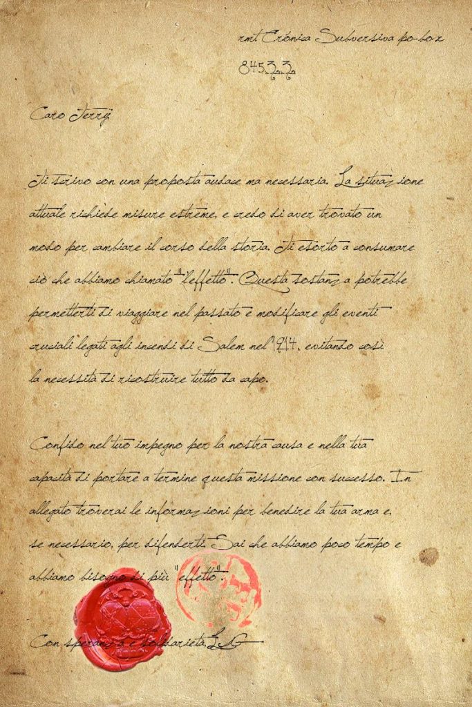 Los objetivos y motivaciones de Luigi son muy sencillos, necesita alguien que viaje en el tiempo a la fábrica de zapatos de Salem antes de incendiarse y obtener la receta de la droga, «ya he perdido bastante gente intentándolo» y ahora va a utilizar a cualquiera que se le interponga en su camino con ese fin.