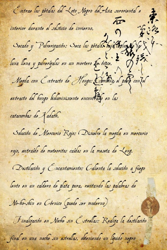 - Mezcla con Extracto de Hongo: Combina el polvo con el extracto del hongo bioluminiscente encontrado en las catacumbas de Kadath.